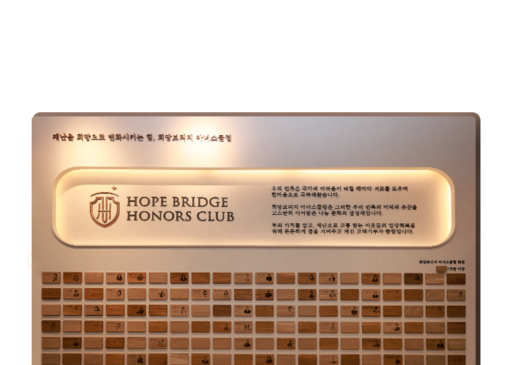 우리 민족은 국가적 어려움이 닥칠 때마다 서로를 도우며 한마음으로 극복해왔습니다. 희망브리지 아너스클럽은 그러한 우리 민족의 미덕과 유산을 고스란히 이어받은 나눔 문화의 결정체입니다. 부의 가치를 알고, 재난으로 고통 받은 이웃들의 일상 회복을 위해 든든하게 곁을 지켜주고 계신 고액기부자 클럽입니다.